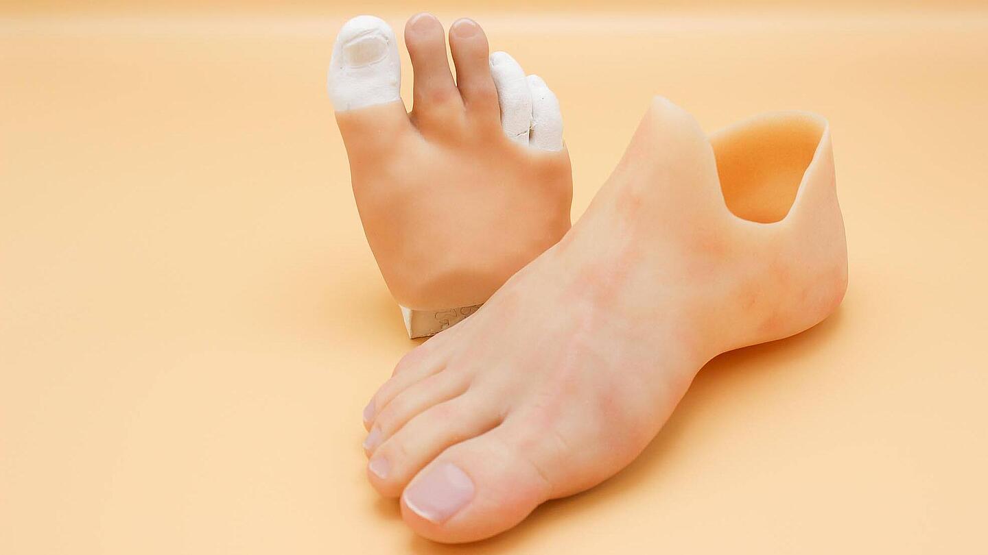 Wir bieten Ihnen eine breite Palette verschiedener Fußprothesen bspw. aus Silikon- und/oder Carbon-Verstärkung an. Unsere Techniker gleichen den fehlenden Körperteil detailgetreu aus, damit Sie nicht nur einen funktionierenden Ersatz bekommen, sondern auch einen, mit dem Sie sich identifizieren können. Wir orientieren uns an der vorhandenen gegenüberliegenden Seite und rekonstruieren das verlorene Körperteil bis hin zu auffälligen Hautstrukturen, Pigmentflecken und Fußnägeln. Somit steht auch dem Tragen von konfektionierten und offenen Schuhen nichts mehr im Weg. Silikon hat auch die Eigenschaft wasserabweisend zu sein. Daher können Sie auch Ihre Fuß- oder Zehenprothese aus Silikon beim Baden unbedenklich einsetzen.